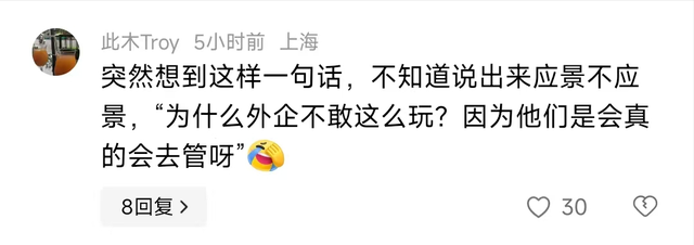 上海网友说:短暂思到这样一句话,不知谈说出来应景不应景,“为什么外企不敢这样玩?因为他们是会确实会去管呀”