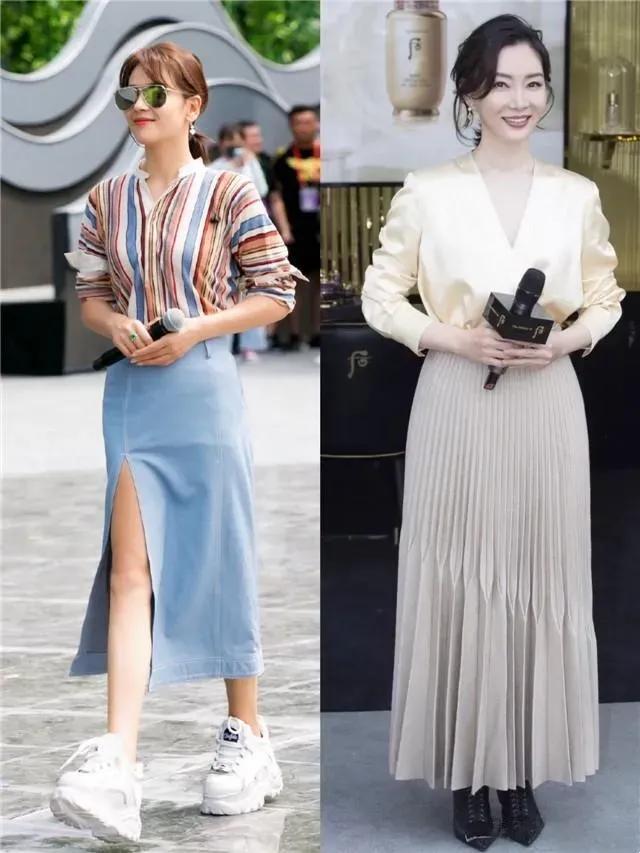 天然啦,平淡穿搭,我们也曾遴遴聘半身裙来搭配,举例刘涛用的是一件条纹的衬衫,上衣搭配上雾霾蓝的开叉半身裙,脚上穿了一对厚底小白鞋,你还真别说,这么的穿搭照实显得年青。