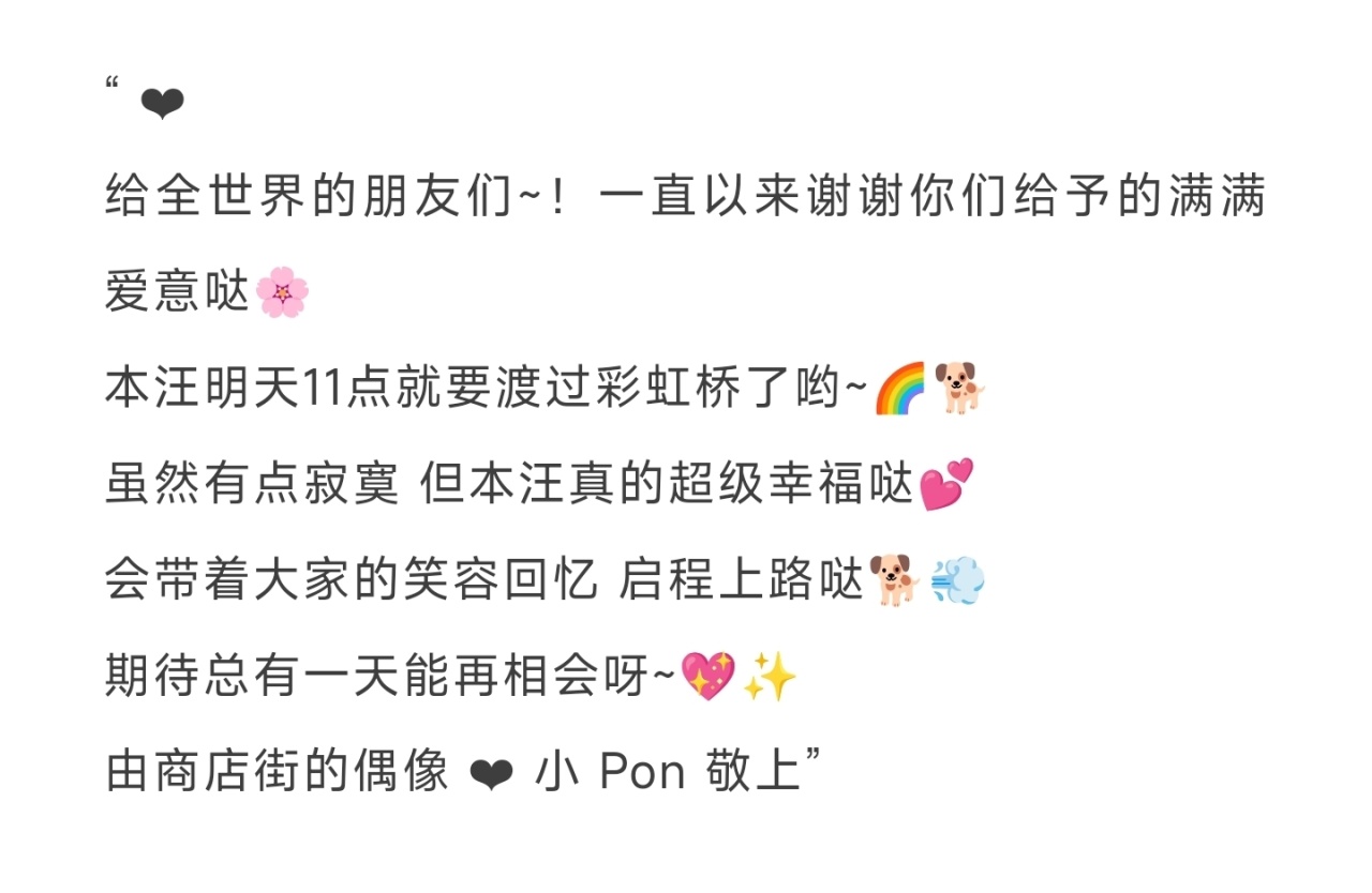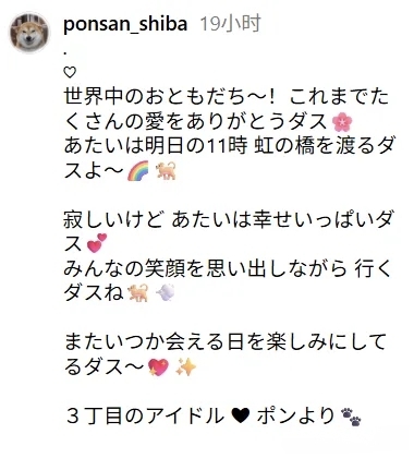 8月31日,Ponsan的主东说念主公布了Ponsan的最新音讯,示意在9月1日的11点,将赐与病重的Ponsan安乐逝世。这位网友显着不但愿众人太过伤心,是以师法小狗的口吻,与众人境别。