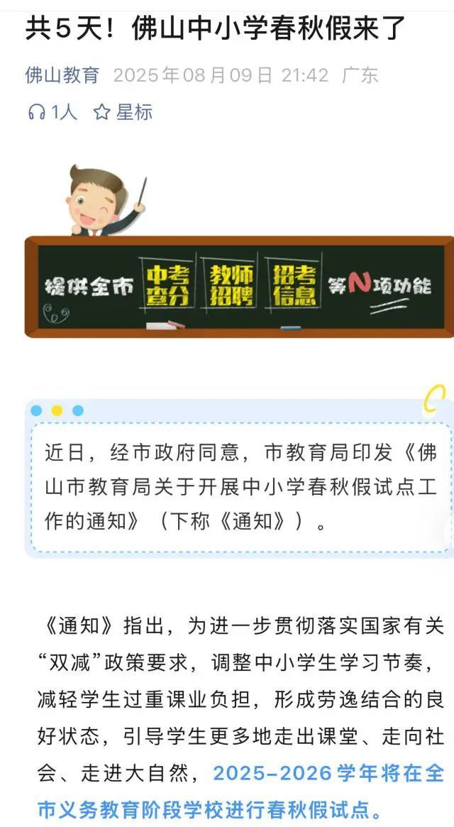8月9日,佛山市西宾局发布试点中小学春秋假的见知。