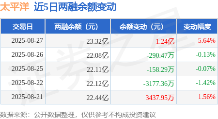 本站音讯,8月27日,太平洋(601099)融资买入5.05亿元,融资偿还3.89亿元,融资净买入1.16亿元开云kaiyun,融资余额23.1亿元。