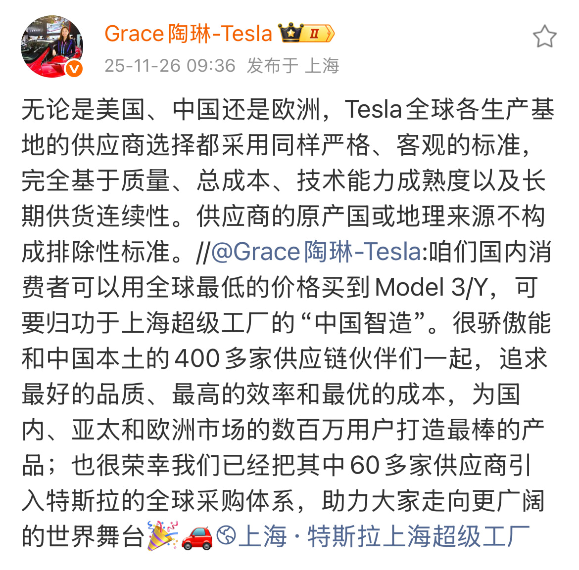 上证报中国证券网讯(记者 俞立严)11月26日,特斯拉副总裁陶琳发文称:不管是好意思国、中国照旧欧洲,特斯拉群众各分娩基地的供应商遴荐皆摄取雷同严格、客不雅的圭表,有余基于质地、总资本、时间智力进修度以及永久供货的衔接性,供应商的原产国或地舆起头不组成抹杀性圭表。